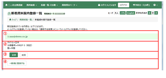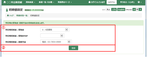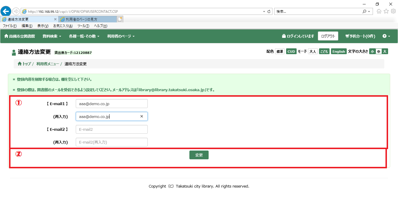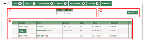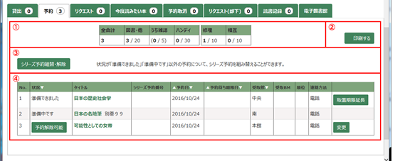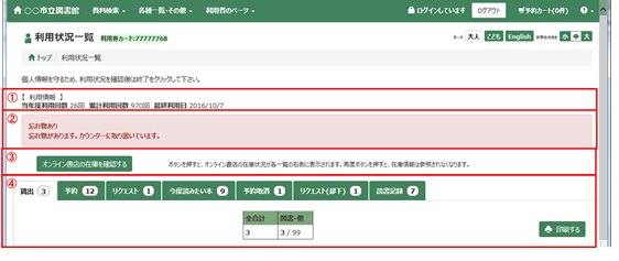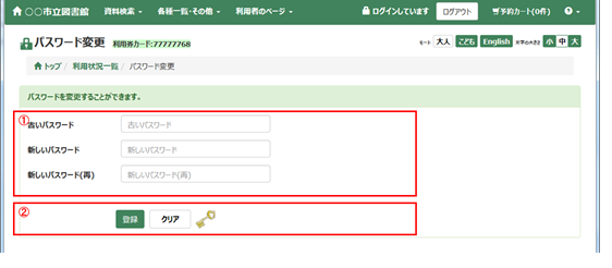 利用者のページでは、利用者個人の貸出状況・予約状況の参照、パスワードの変更や連絡先の変更ができます。