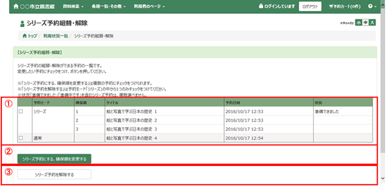 予約資料の内、シリーズ予約の変更ができる資料の一覧が表示されます。