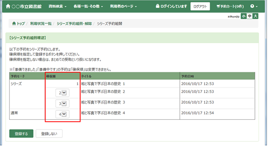 確保順を指定して登録するボタンを押します。ボタンを押すと、登録処理が実行され、予約一覧画面に戻ります。
