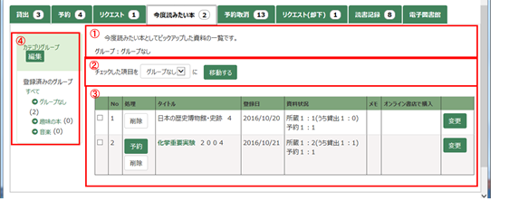 グループ名をクリックすると、該当グループの今度読みたい本の一覧に表示が切り替わります。