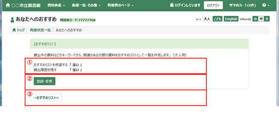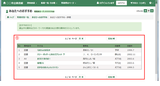 利用者がおすすめリストの申請をしている場合、現在の貸出資料、予約資料などから、同じジャンルや著者など関連する分野の資料を検索し、その中から、人気の高い資料をおすすめリストとして集計し、提供します。