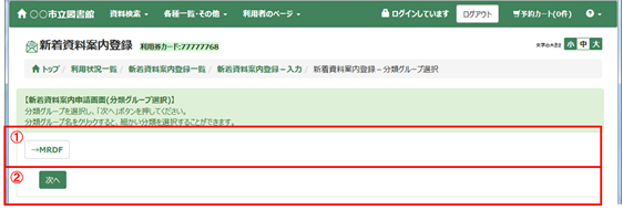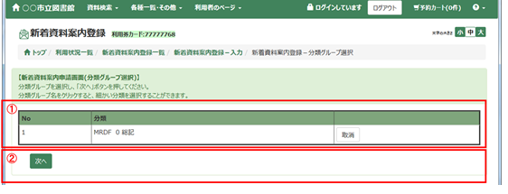 分類グループを選択すると、分類表画面へ遷移します。分類表画面で分類番号を指定すると、分類番号選択後画面に切り替わります。