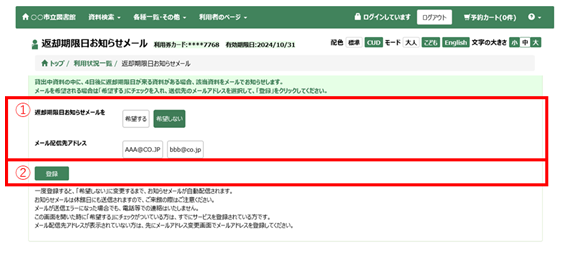 返却期限日の1日前にお知らせメールを受け取るかどうかを登録することができます。