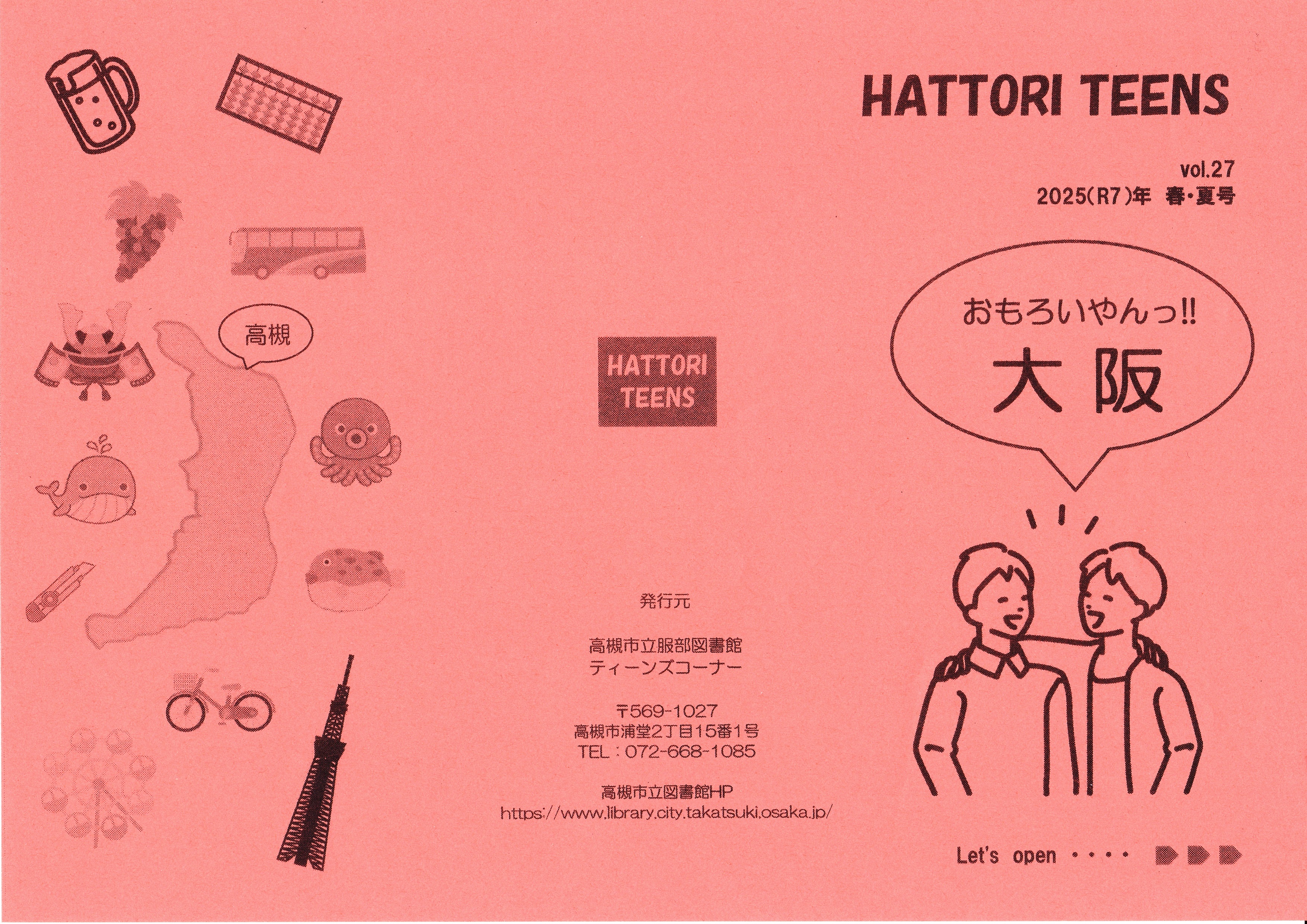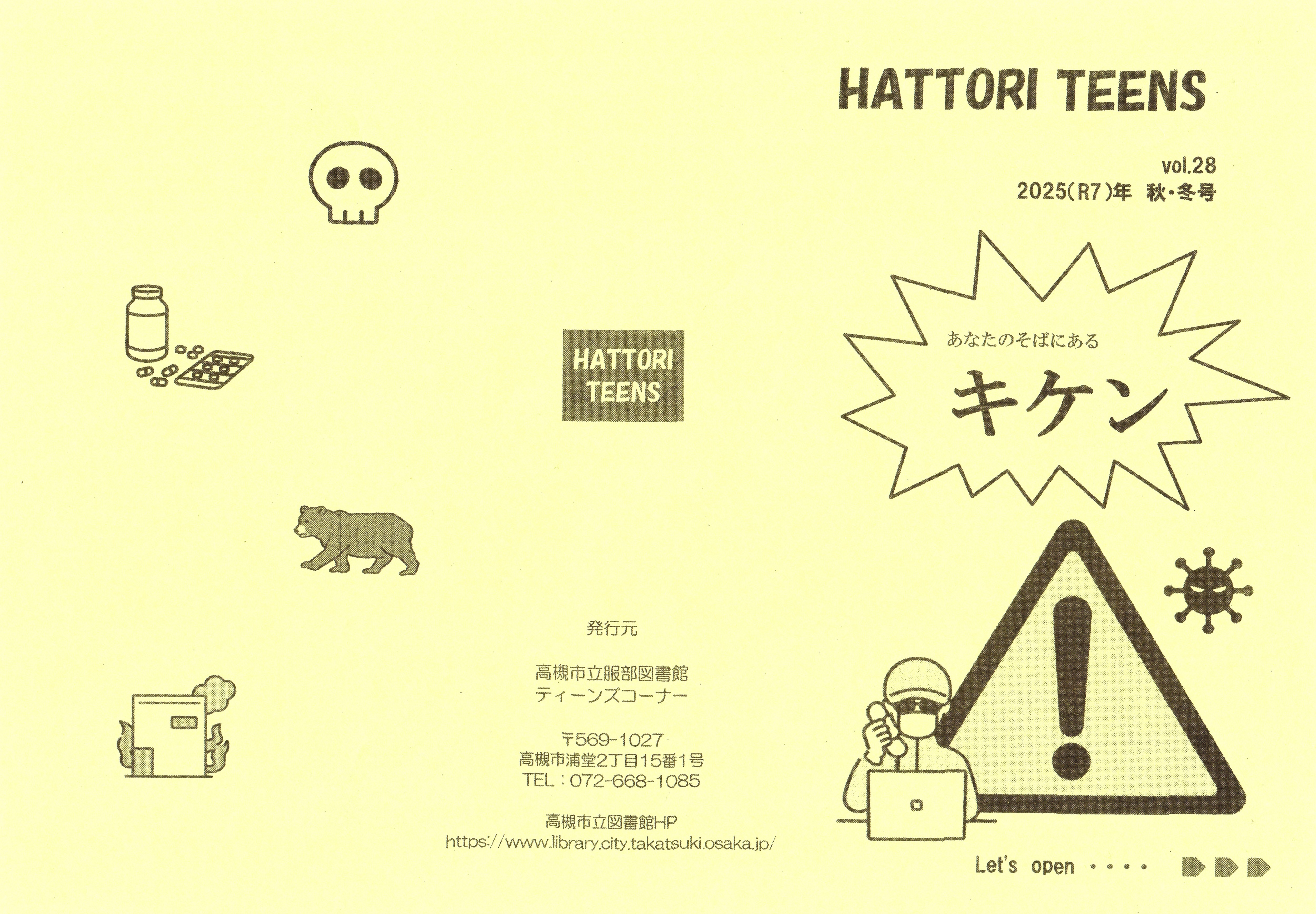 服部図書館では、10代のみなさんと図書館を結ぶ情報誌「HATTORI TEENS」を発行しています。新着情報や書評案内などいろいろな情報を発信していますのでご覧ください。
